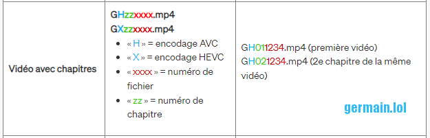 Les caméras GoPro ont une convention de nommage des fichiers vidéos assez particulière, qui les place dans le désordre quand on trie par ordre alphabétique. Exemple :