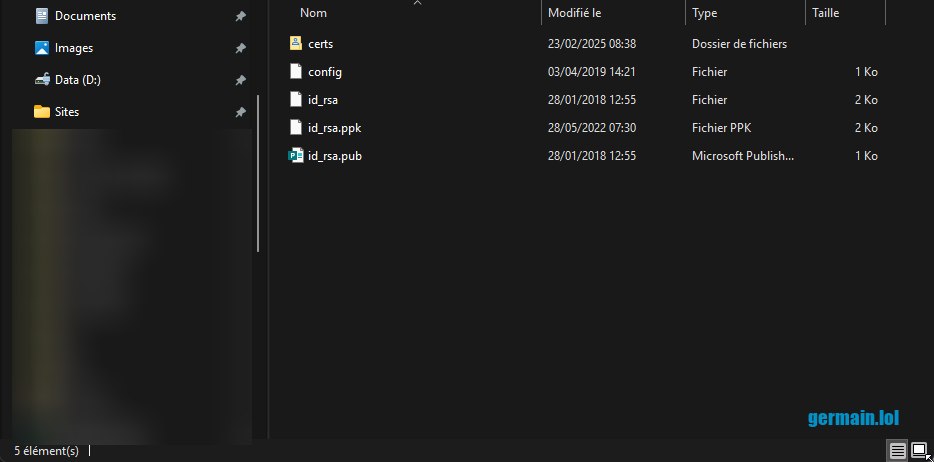 Admettons que la paire de clés SSH soit dans D:\germain\ssh