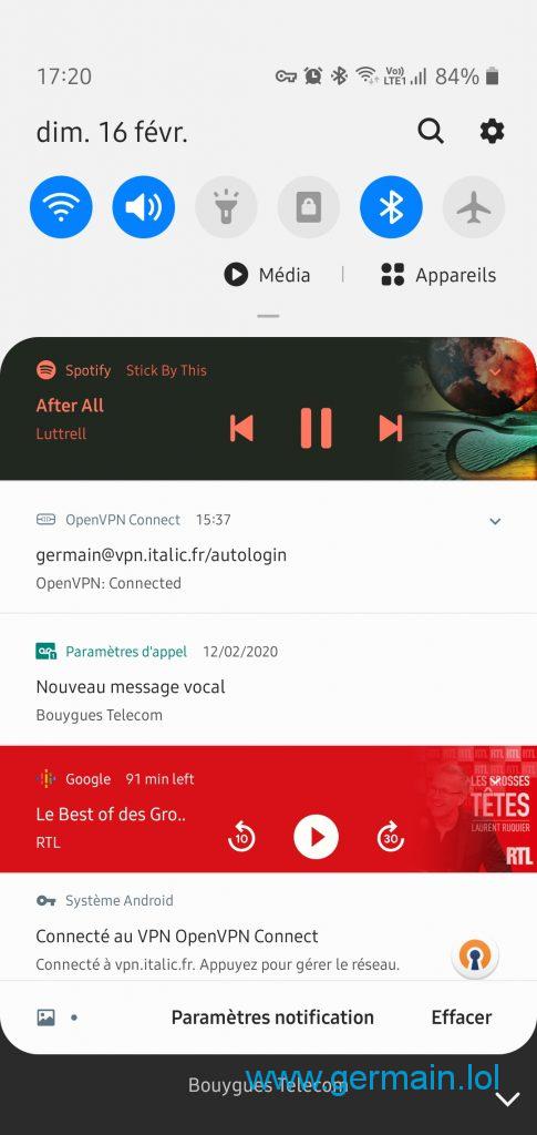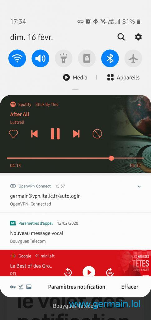 Le volet des notifications, qui s’appelle peut-être aussi volet de contrôle, ou volet de raccourcis, est évidemment pratique pour effectuer des actions rapides en rapport avec l’activité du mobile (ex : marquer comme lu un message, passer à la chanson suivante…)