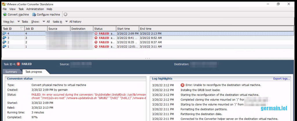 FAILED: An error occurred during the conversion: ‘GrubInstaller::InstallGrub: /usr/lib/vmware-converter/installGrub.sh failed with return code: 127, and message: FATAL: kernel too old Error running vmware-updateGrub.sh through chroot into /mnt/p2v-src-root Command: